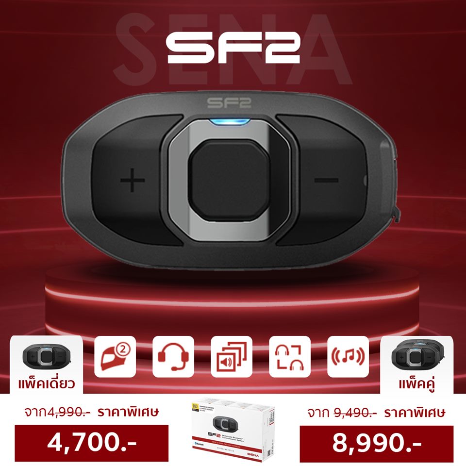 ปรับให้เหมาะสมสำหรับการขี่แบบสองทาง SF2 มีอินเตอร์คอมแบบสองทางในตัวเพื่อสร้างการเชื่อมต่อที่ชัดเจนระหว่างผู้ขับขี่และผู้โดยสาร ชุดอุปกรณ์ชิ้นเดียวนี้มีทุกสิ่งที่คุณต้องการเพื่อเชื่อมต่อกับสมาร์ทโฟนของคุณเพื่อเพลิดเพลินกับความสะดวกสบาย เช่น การนำทาง การโทร และฟังเพลง SF2 มีตัวเลือกไมโครโฟนสองแบบที่แตกต่างกัน ดังนั้นจึงสามารถติดตั้งได้กับหมวกกันน็อคแบบเต็มใบ แบบเปิดหน้า หรือแบบโมดูลาร์